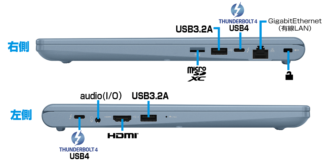 ほとんどのWindowsPCが、このUSB4,Thunderbolt4のTypeCコネクタが2つの場合、左右どちらか片方の側面に並べて配置していますが、Dynabookは左右に分けて配しています。これにより、自宅で充電するときなど、コンセントの位置にあわせて左右どちらにも繋げることが出来ます。