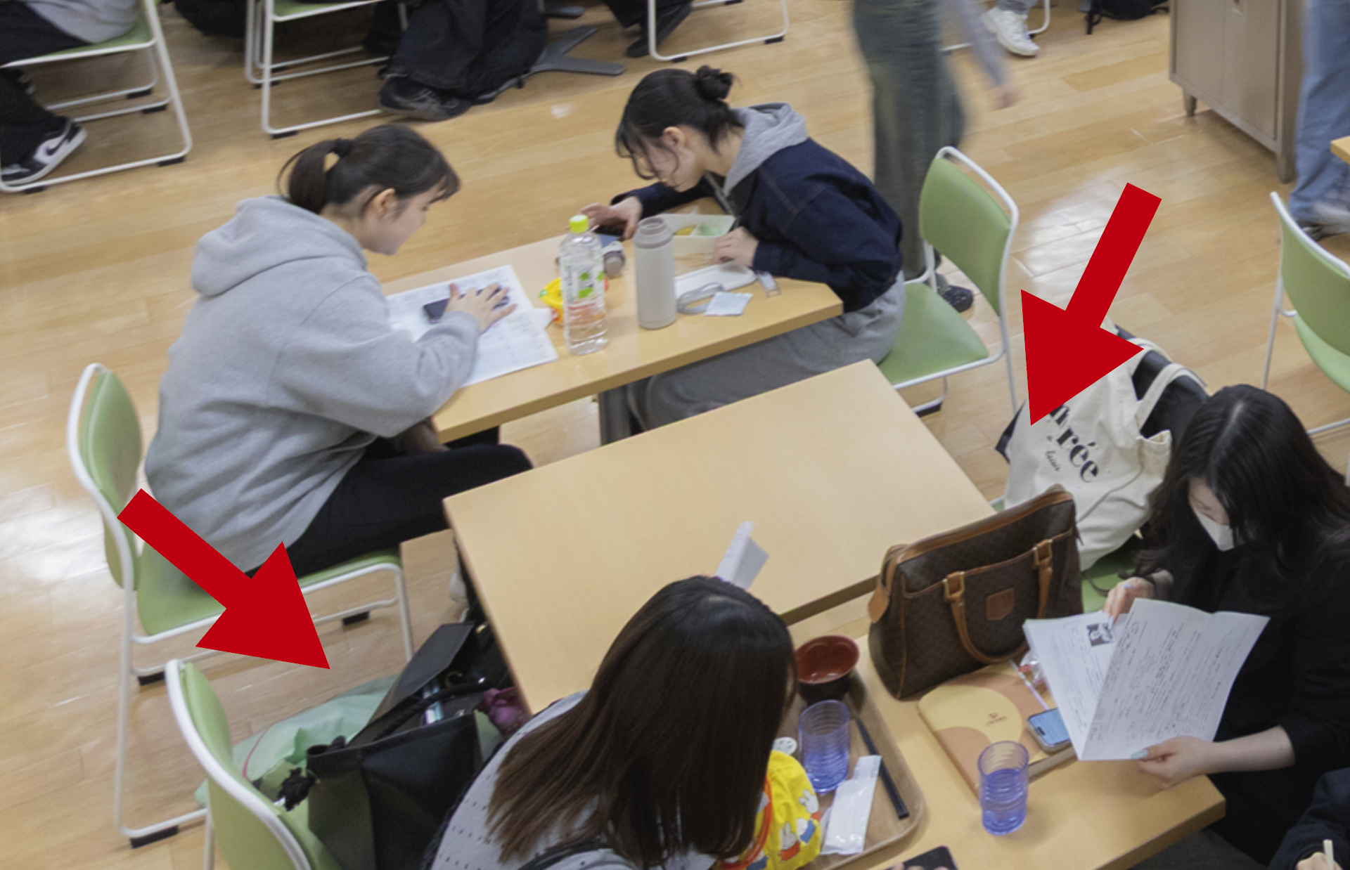 でも、何も知らずに、荷物と受け取ったラーメンを持ったまま座る場所を探している1年生から見れば「不公平」に見えるでしょう。「次からは自分も同じように席取りしよう」となってしまいます。