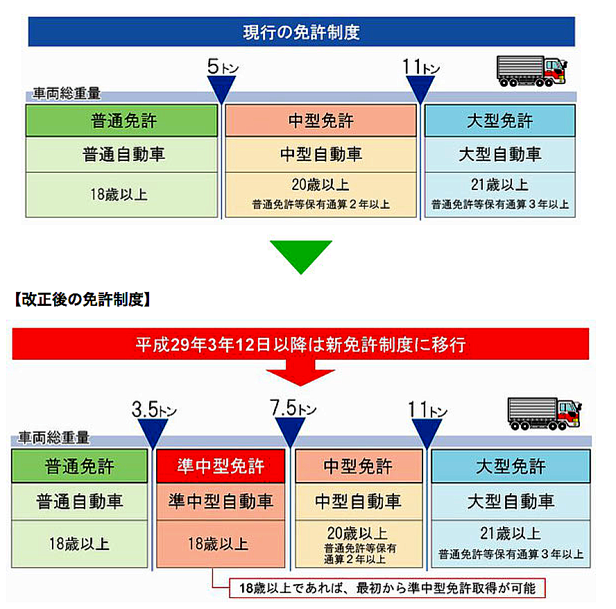 ※改正前にとった人は3年後の免許更新時に自動的に「準中型(5t限定)」となる。この条件は(免許取り消しにならない限り)生涯引き継がれる。