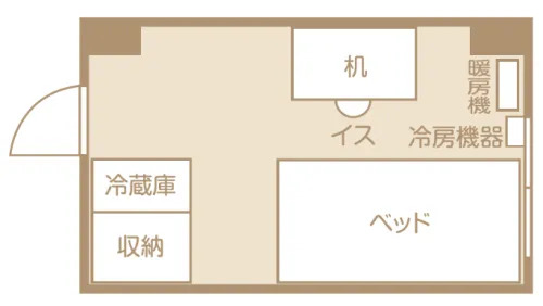 | その他の設備 | 室内設備: ベッド、机、イス、照明、冷蔵庫、冷房機器、カーテン、収納本棚一体型(居室により仕様が異なる場合あり) 共用設備: オートロック、エレベーター、食堂、キッチン、電子レンジ、大浴場、シャワー、トイレ、ランドリールーム、防犯カメラ、シューズボックス |