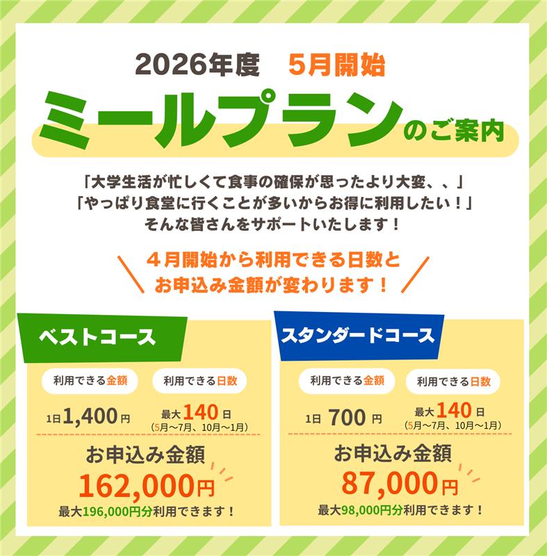 事前に1年分の食費をお預けいただくことで、現金がなくても食堂を毎日定額利用できる大学生協の食事サポートシステムです。ミールプランがあれば、食費の節約による欠食を防ぎ、栄養バランスを意識して食事を組み立てる正しい食習慣を身につけることができます。ミールプランは大学生協アプリ・学生証に機能として付与されるため、お財布がなくても安心!