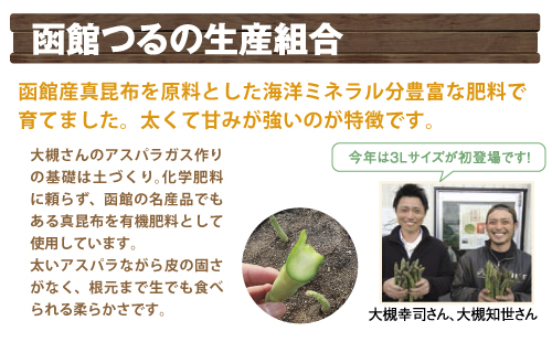 サイズ表記はホクレン農業協同組合連合会のアスパラ標準規格に準じています。 上記の基準で選別していますが、太さや本数にばらつきがありますのでご了承ください。