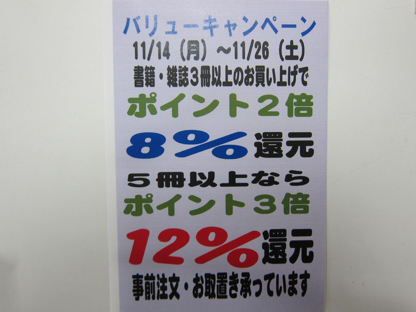 2016/11/19 書籍店では11月26日まで、ポイントがお得なキャンペーンを開催中です! まとめての購入点数が、3冊以上でポイント2倍、5冊以上だと3倍になります! 雑誌やコミック等も対象になっていますので、この機会にコミックの大人買いなどいかがでしょうか たくさんのご利用をお待ちしております。