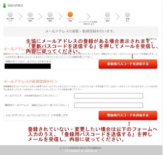 ※登録されていない場合は「登録されているメールアドレスはありません」と表示され、「更新用パスコードを送信する」ボタンは出ません。