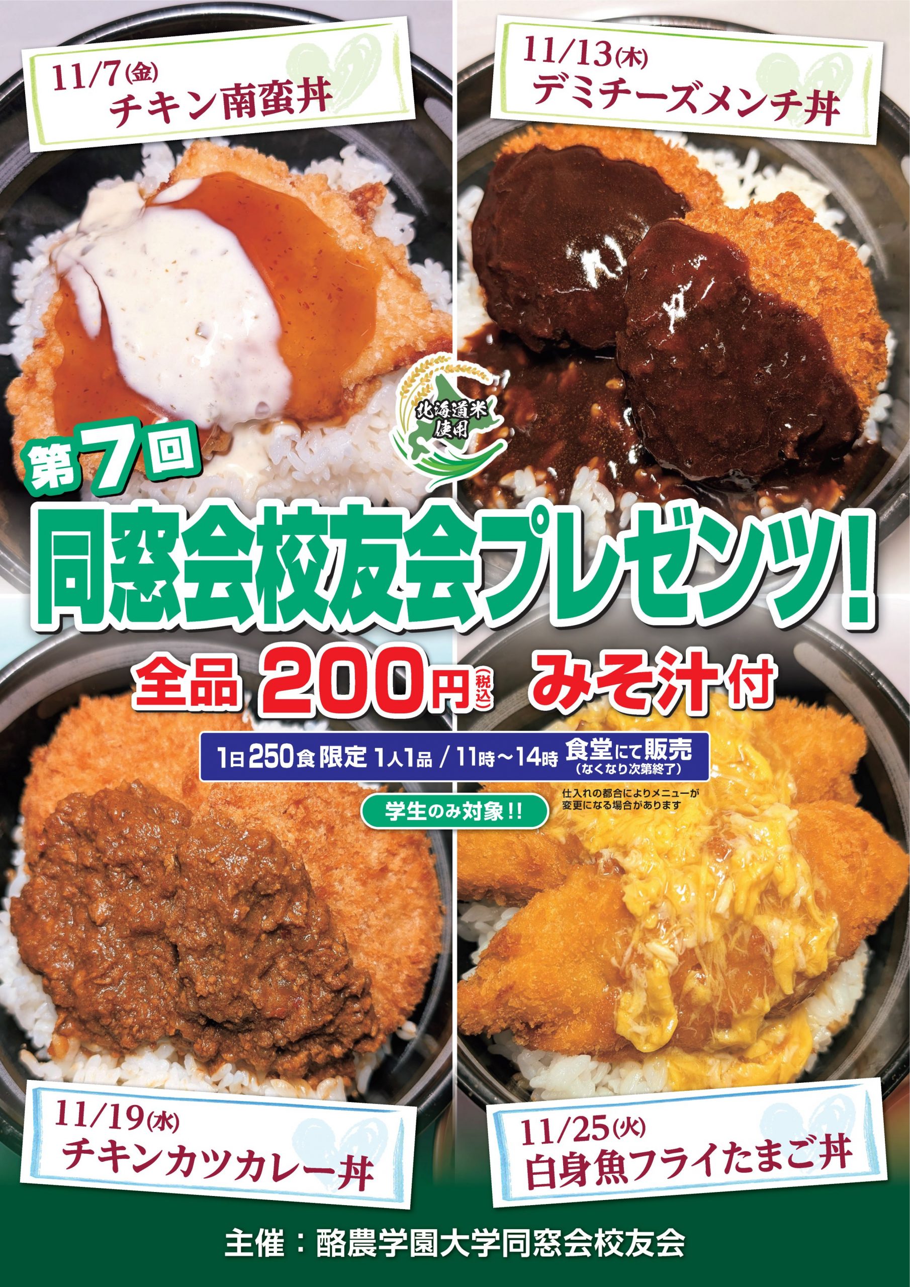 2025/10/23 同窓会校友会の学生支援企画のお知らせ 同窓会校友会では学生支援の一環として、4週リレーで200円丼を提供します。 11月7日 チキン南蛮丼 11月13日 デミチーズメンチ丼 11月19日 チキンカツカレー丼 11月25日 白身魚フライたまご丼 味噌汁付き、全品200円(税込) 先着250食限定 ぜひ、ご利用ください。